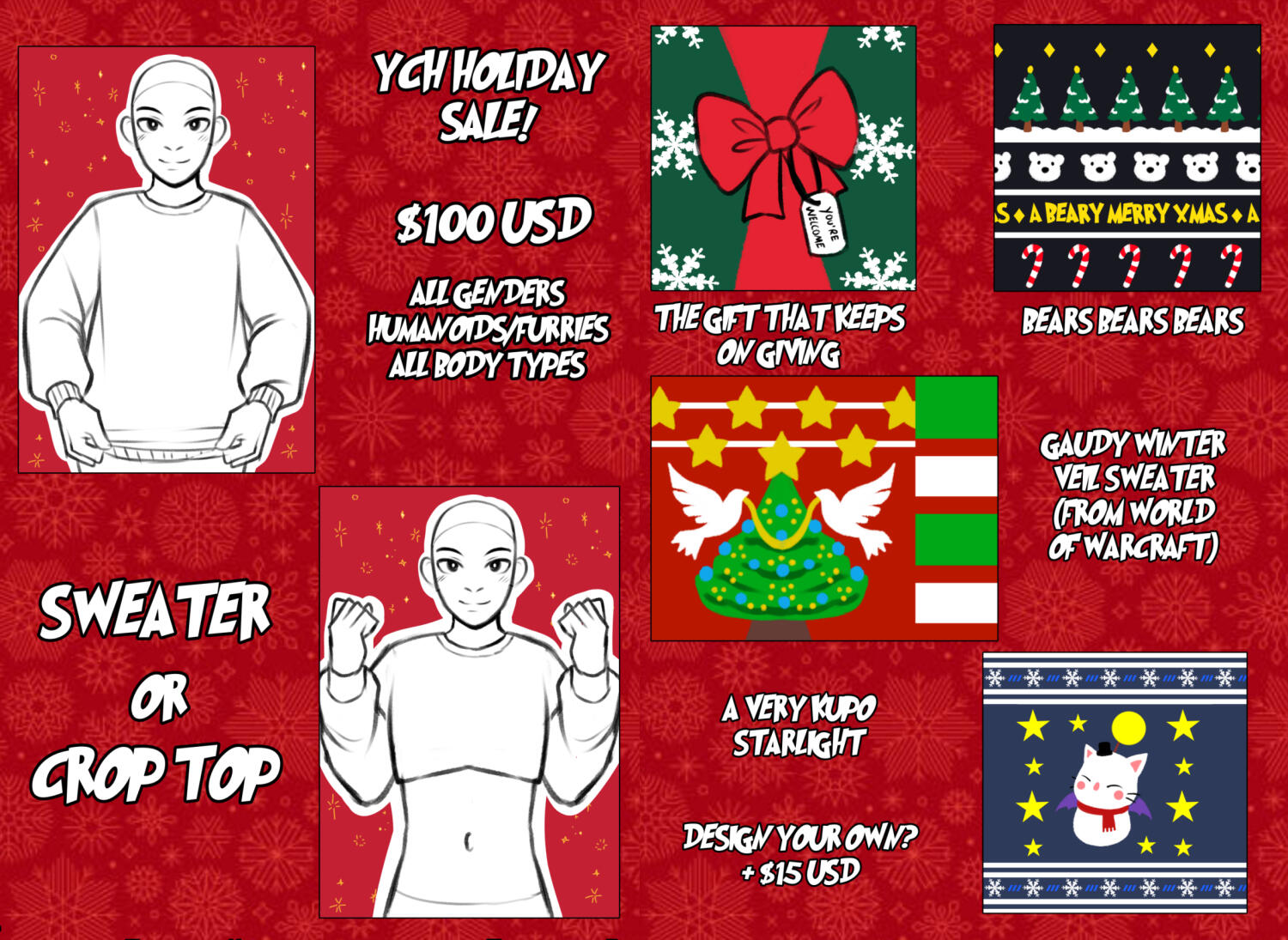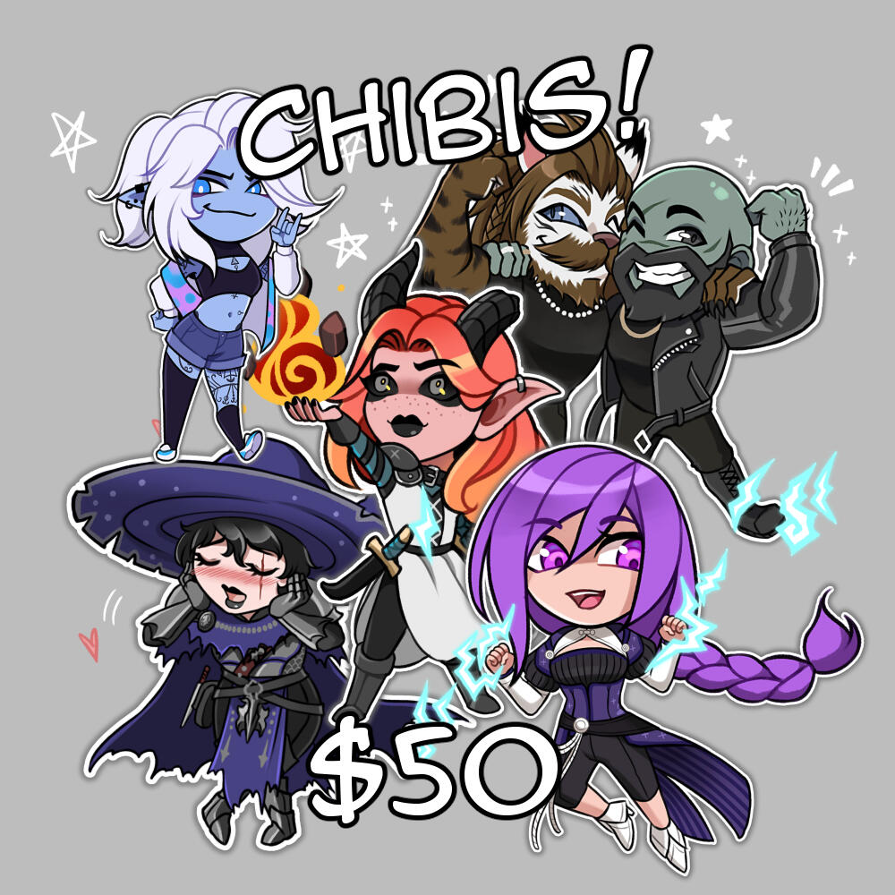 Additional characters, backgrounds, etc. are available upon request with added costs, of which I am happy to discuss one-on-one with clients via email correspondence.